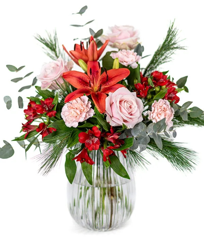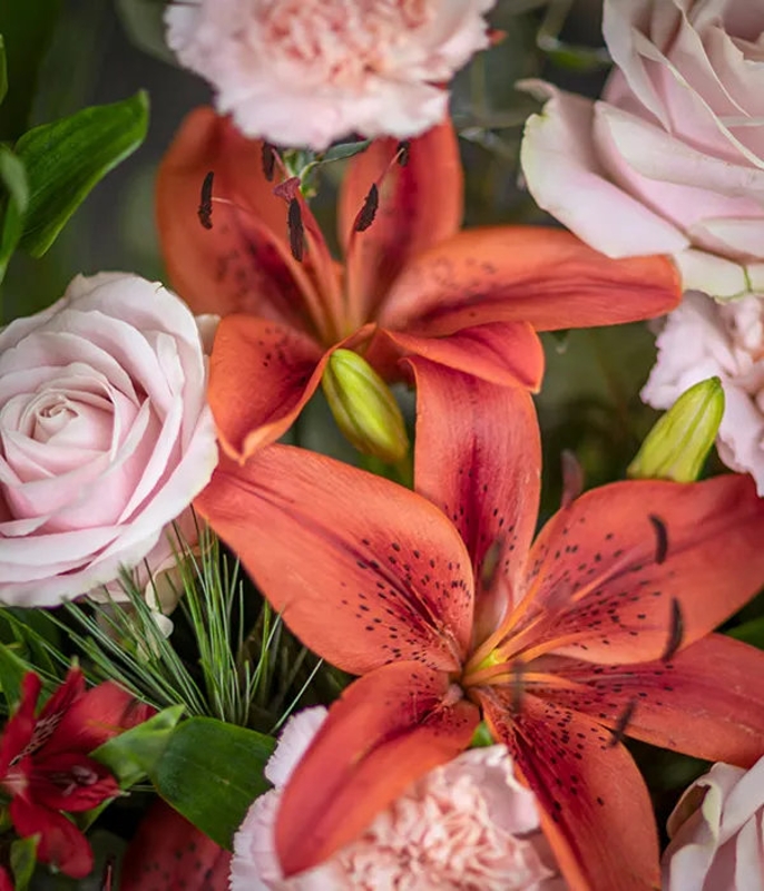 A beautiful hand-tied bouquet including soft pink roses, red alstroemeria, red lilies, pale pink carnations, and seasonal foliage.