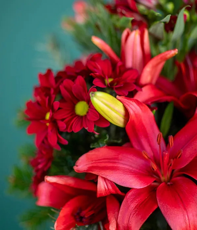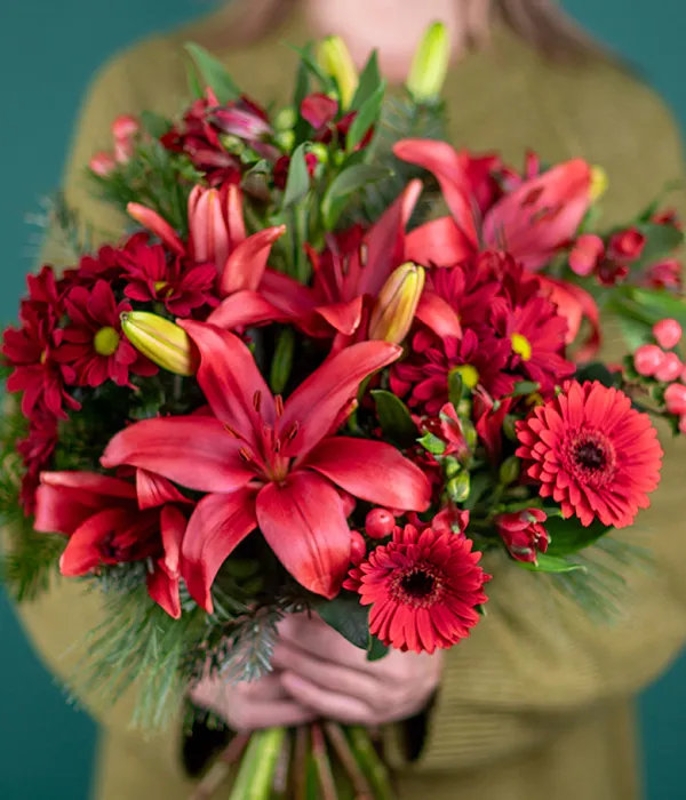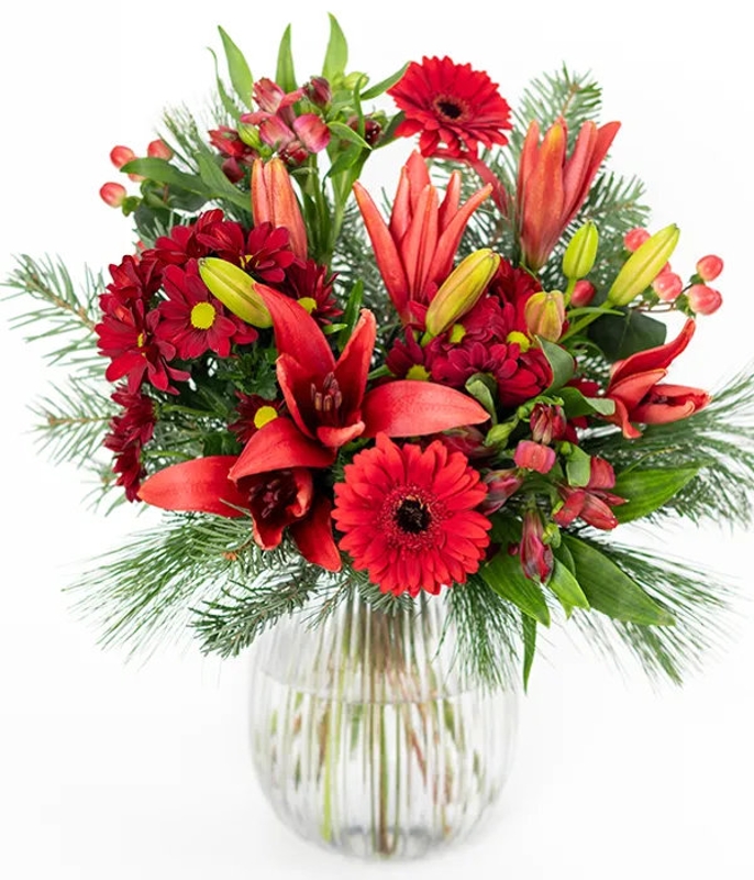 A bouquet that embodies this magical season. Our Merry Christmas florist bouquet includes red chrysanthemums, lilies, alstroemeria, germini, and hypericum berries alongside seasonal foliage