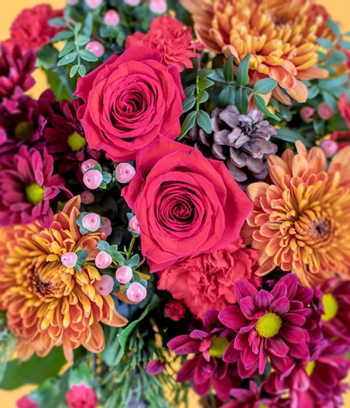 A bright and beautiful festive bouquet! This arrangement is filled with red spray carnations, orange blooms, chrysanthemum, hypericum, pine cones, spruce and seasonal foliage.