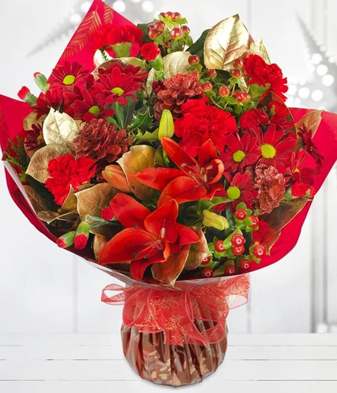 A festive collection of blooms come together to create this Berry & Bright bouquet, with the classic deep red and glistening gold tones, adding to the magic of Christmas.